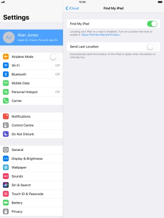Find My iPad enables you to find your tablet if you lose it or you can lock it should it get stolen. To select settings for Find My iPad, you need to activate your Apple ID on your tablet.